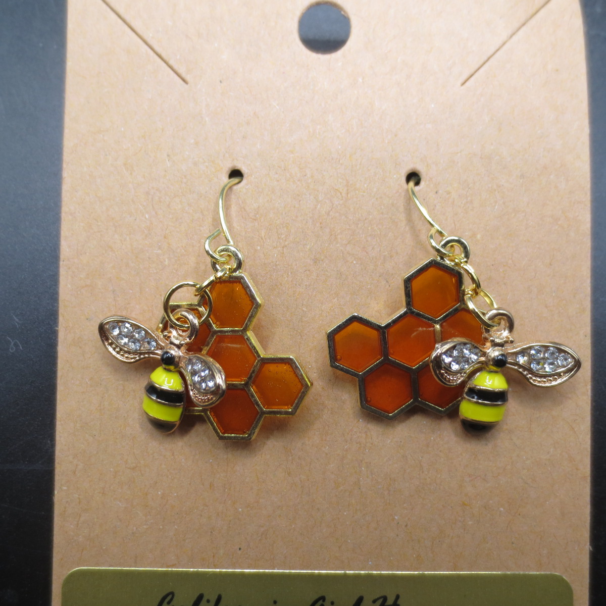 Adorable and sparkly honey bee on honeycomb earrings. Earring hooks are made of solid brass, 14k gold plated. Lead, Nickel, Cadmium Free and Hypoallergenic. $10.00 + tax