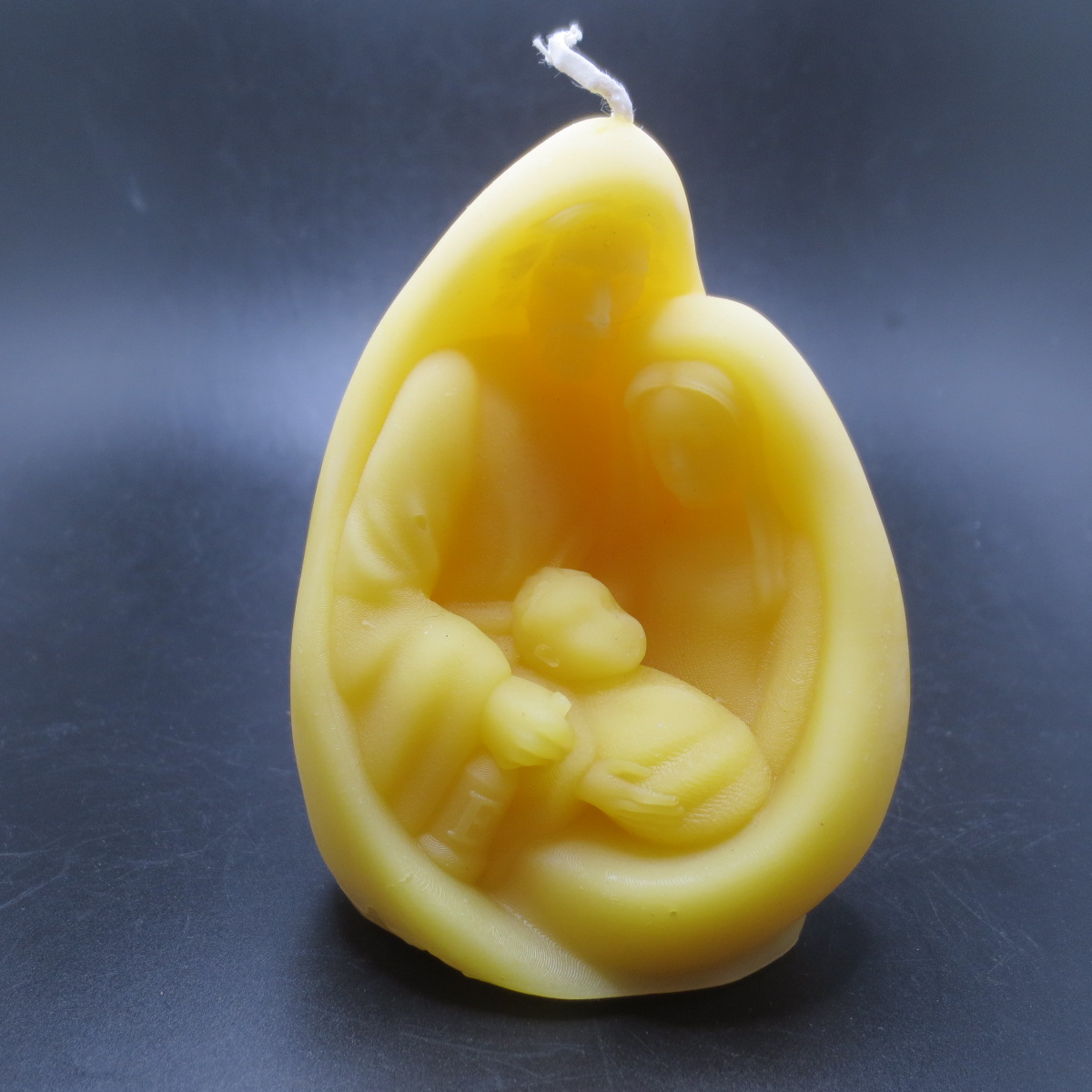 Approximately 6 ounces of pure beeswax molded into The Holy Family. Beeswax candles have a naturally sweet fragrance, burn longer and more clearly, and give off more light than other wax candles. $8.00 + tax