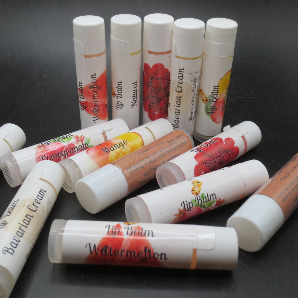 Made with beeswax and other natural ingredients, sure to relieve dry and chapped lips (flavored lip balms have added ingredients). Assorted flavors: Natural (No Flavor), Bavarian Cream, Raspberry, Pomegranate, Watermelon, Mango, Butter Rum, Gingerbread, and Pumpkin Spice. $3.00 + tax