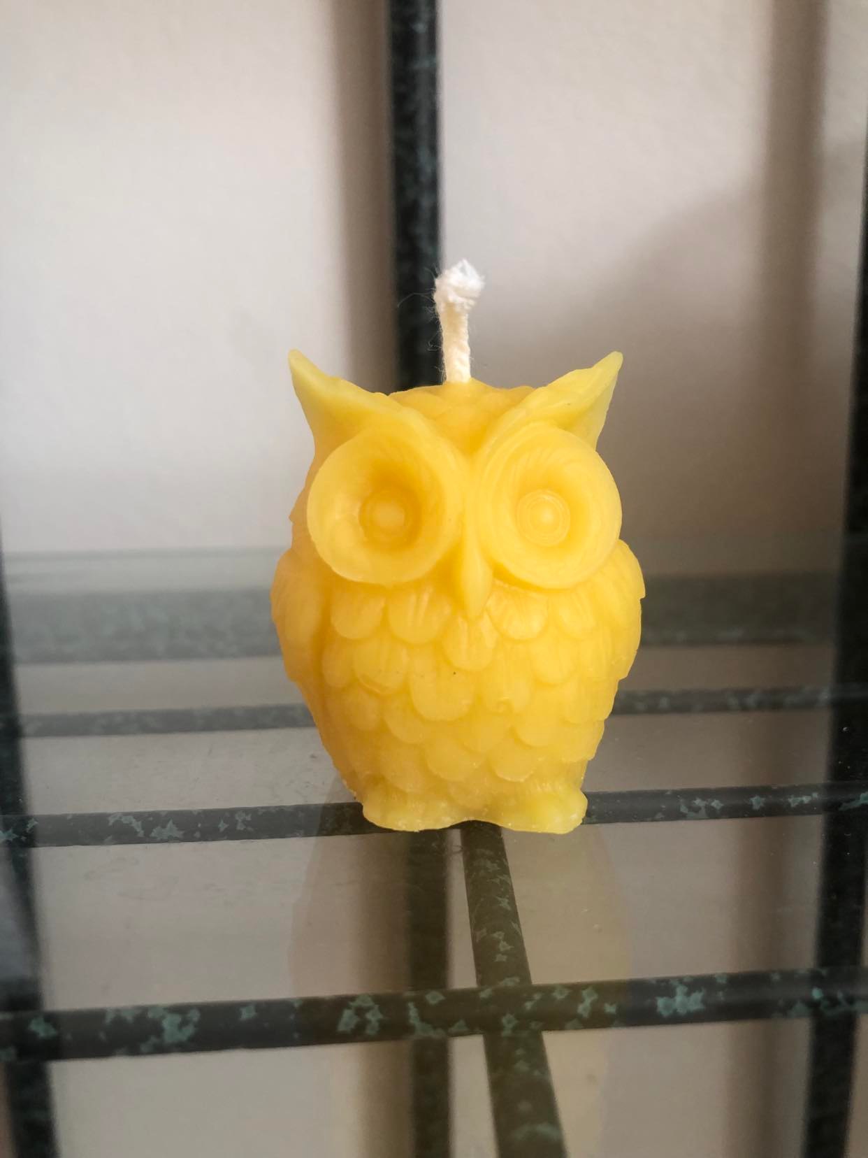 Approximately 1 ounce of pure beeswax molded into an adorable owl. Beeswax candles have a naturally sweet fragrance, burn longer and more clearly, and give off more light than other wax candles. $4.00 +tax