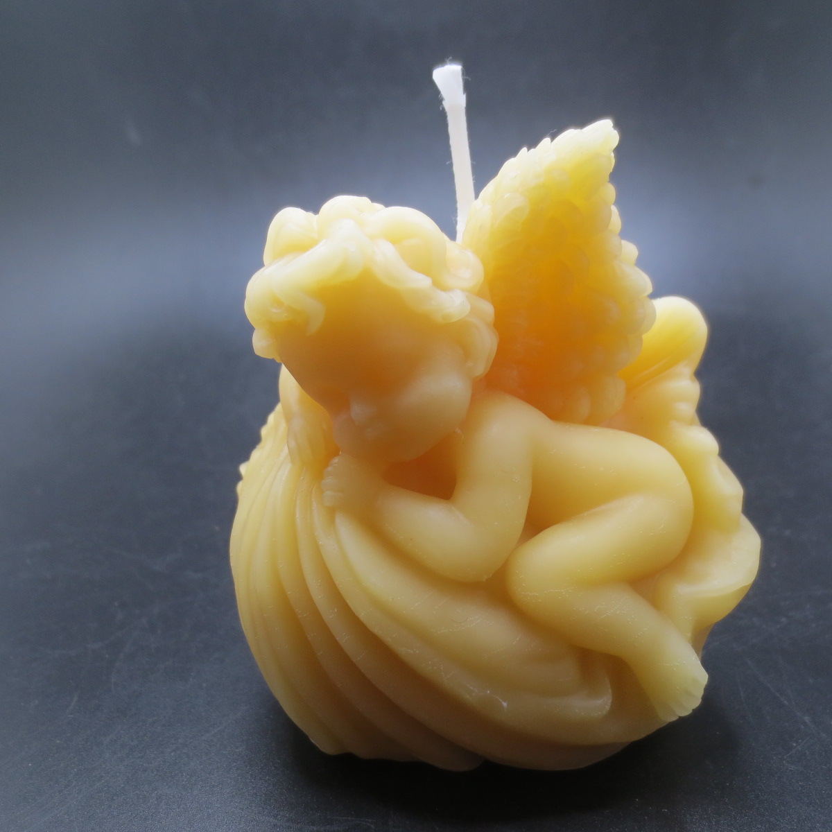 Approximately 4 ounces of pure beeswax molded into an adorable Cherub. Beeswax candles have a naturally sweet fragrance, burn longer and more clearly, and give off more light than other wax candles. $5.00 + tax